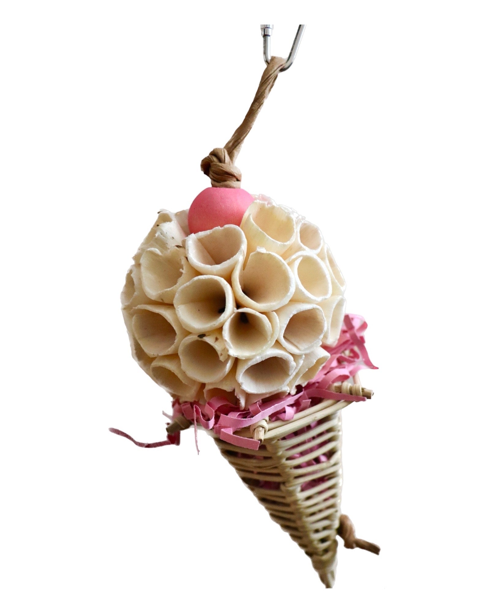 Ce cornet de crème glacée est fait avec une boule de sola, de la vigne et du papier ondulé de couleur.