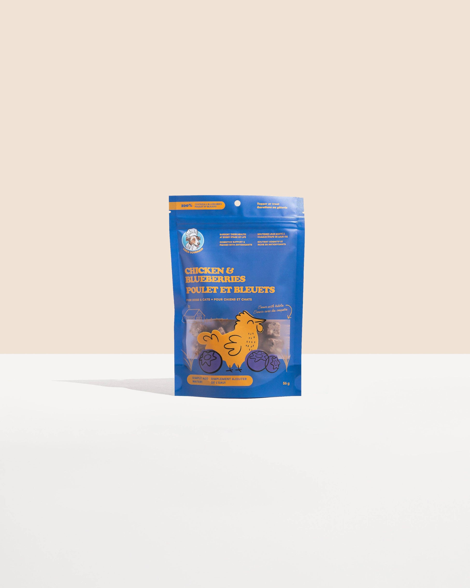 Un mélange simple et efficace pour enrichir les repas de votre animal. Fait de 100 % poulet maigre et de bleuets entiers, ce topper est riche en antioxydants et soutient la cognition, l’immunité et la mobilité articulaire. Léger, savoureux et facile à réhydrater, il est parfait pour les animaux séniors, en convalescence ou difficiles à nourrir.