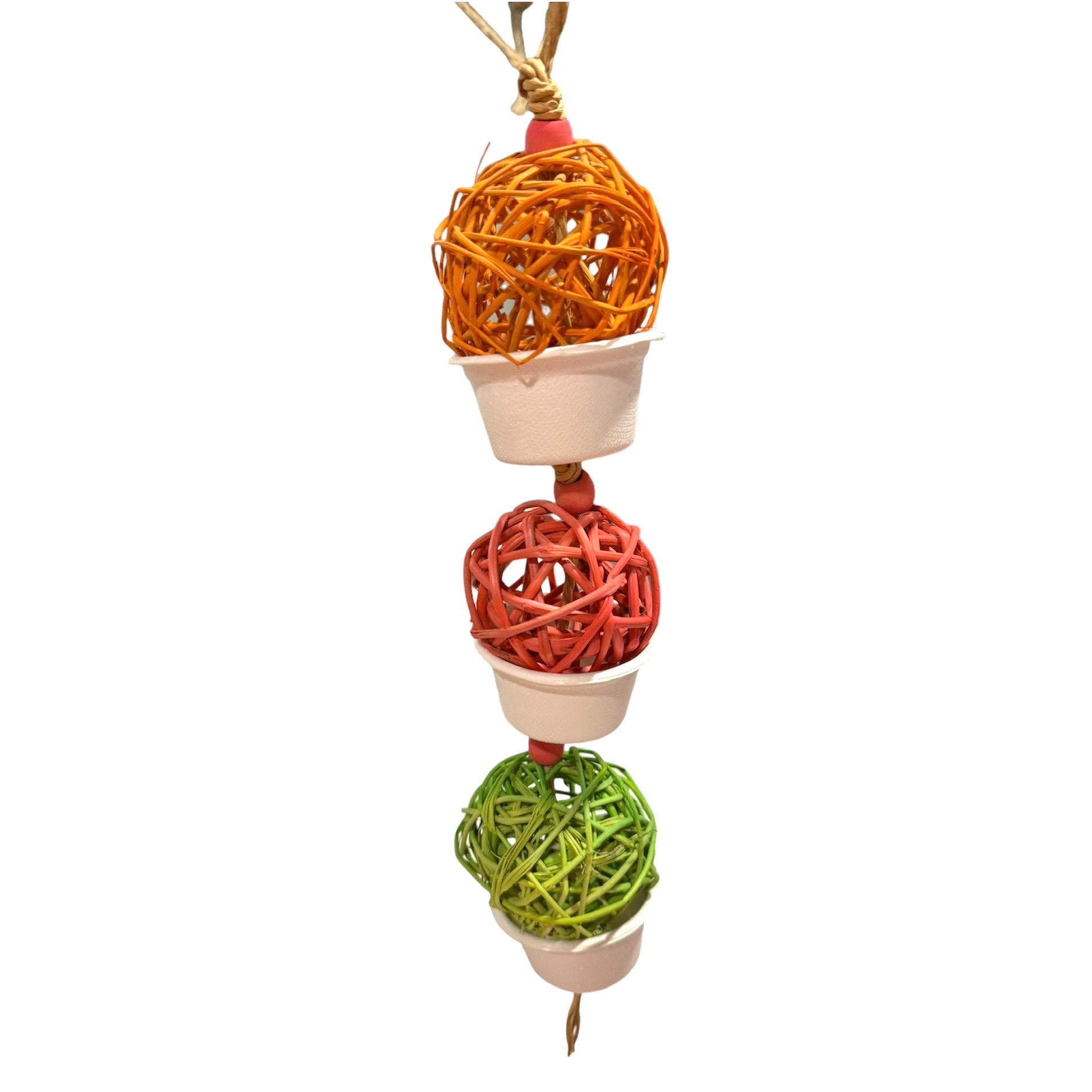 Jouet fabriqué avec des boules de vigne, des billes des bois de pin et des contenants en carton.
