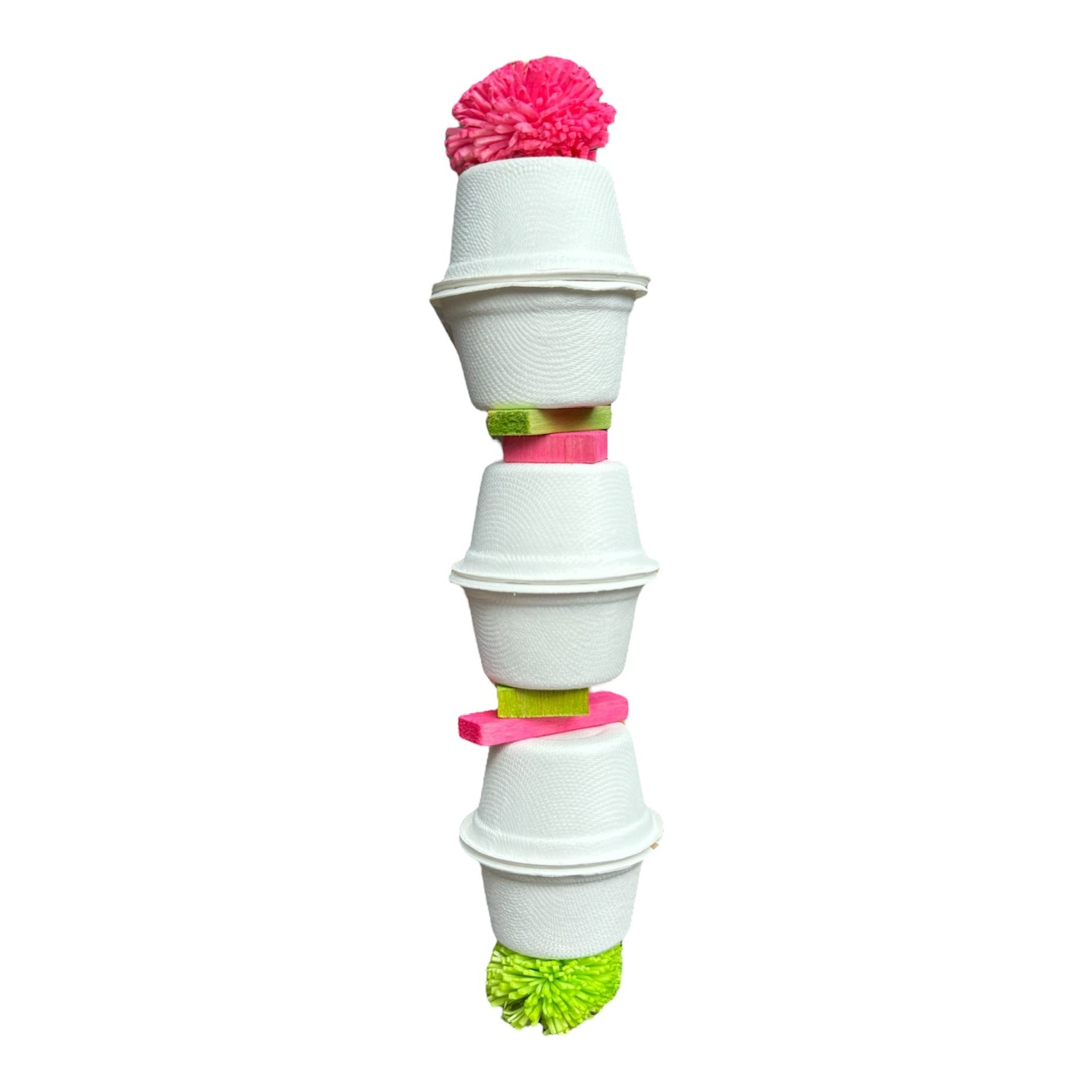 Vous pouvez y retrouver du papier frisé à l'intérieur des petits contenants de carton, vous permettant de cacher des gâteries. Le jouets par excellence pour le foraging!