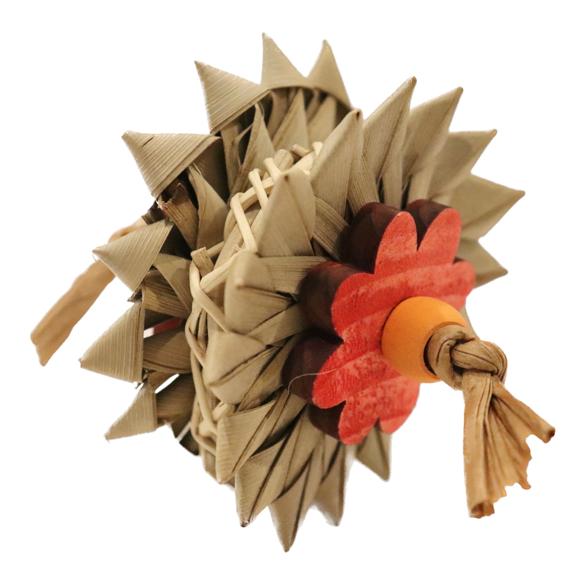 Jouet de pattes fabriqué avec des fleurs de palmier, des fleurs en bois de pin, des billes de bois et un anneau de vigne.