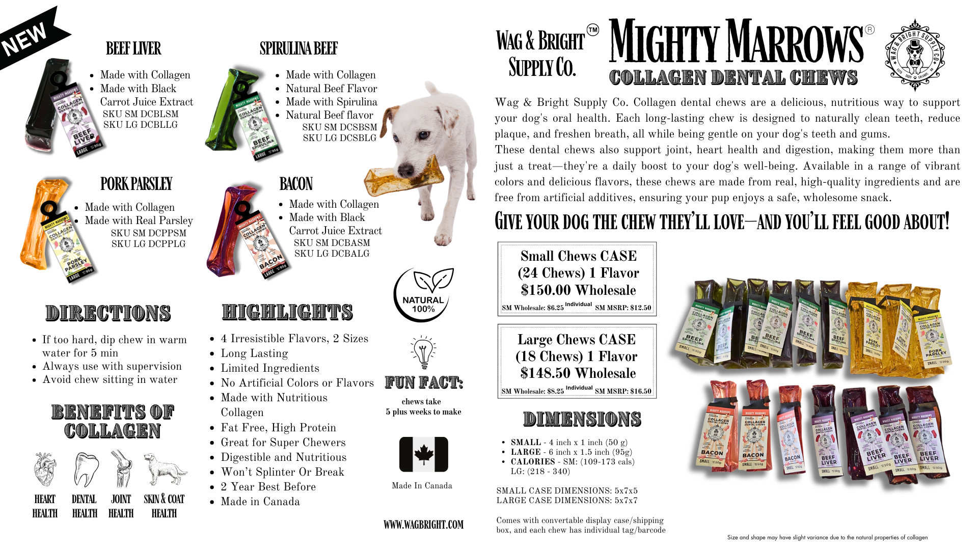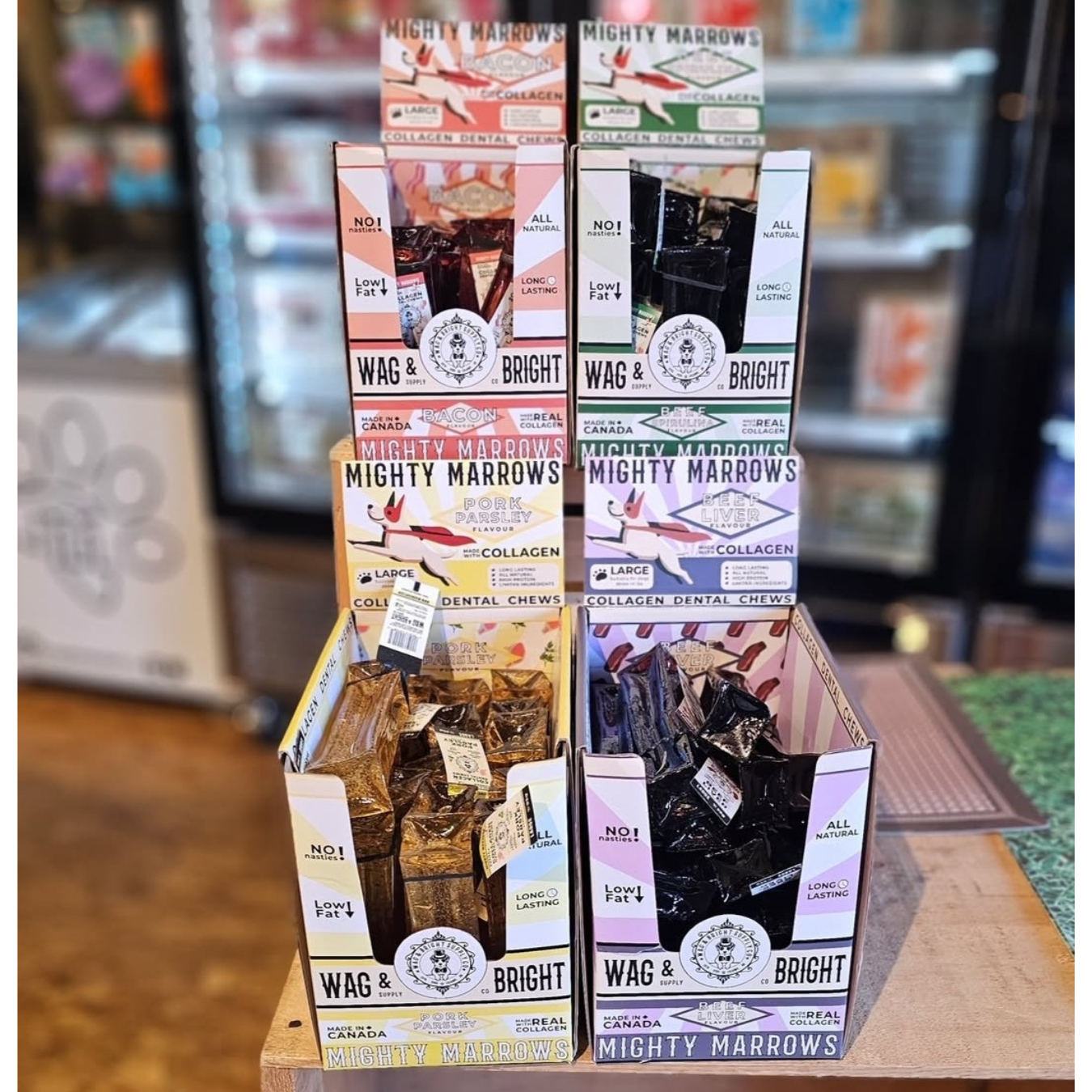 - Les Mighty Marrows Collagen Dental chews sont une façon délicieuse et nutritive de soutenir la santé bucco-dentaire de votre chien. Chaque mâchouille super durable est conçue pour nettoyer naturellement les dents, réduire la plaque et rafraîchir l'haleine, tout en étant douce pour les gencives de votre chien. Idéal pour les super mâcheurs. Ces mâchouilles dentaires soutiennent également les articulations, la santé cardiaque et la digestion, ce qui en fait plus qu'une simple friandise—elles sont un coup de pouce quotidien pour le bien-être de votre chien. Disponibles dans une gamme de saveurs délicieuses et vibrantes, ces mâchouilles sont fabriquées à partir d'ingrédients réels et de haute qualité, sans additifs artificiels, garantissant à votre chien une collation sûre et saine.