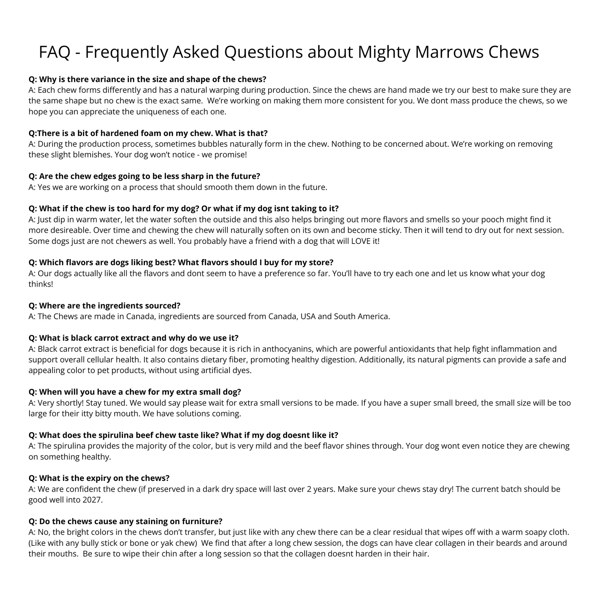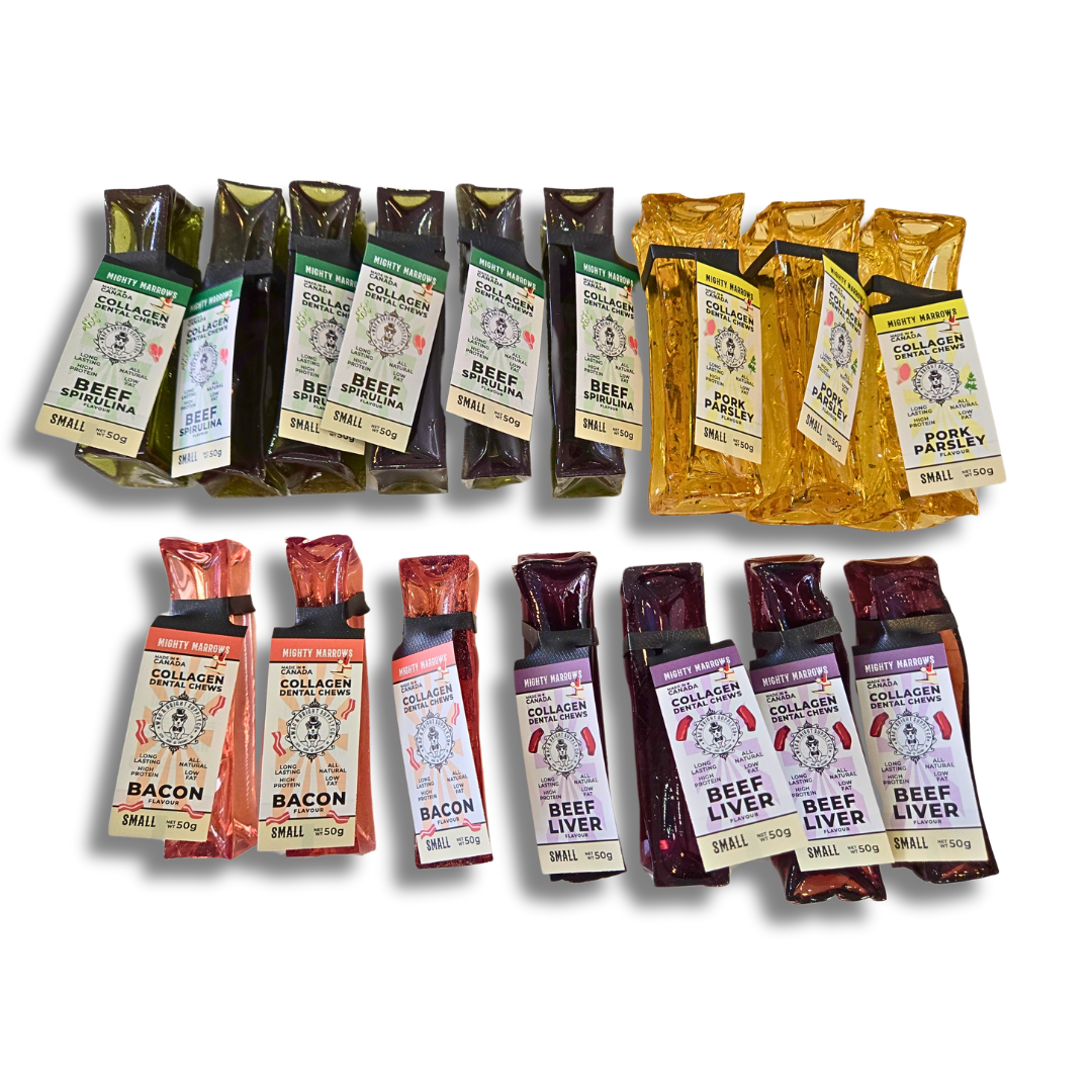 Les bâtonnets dentaires au collagène Mighty Marrows sont une façon délicieuse et nutritive de soutenir la santé bucco-dentaire de votre chien. Chaque bâtonnet, super durable, est conçu pour nettoyer naturellement les dents, réduire la plaque et rafraîchir l'haleine, tout en étant doux pour les gencives de votre chien.