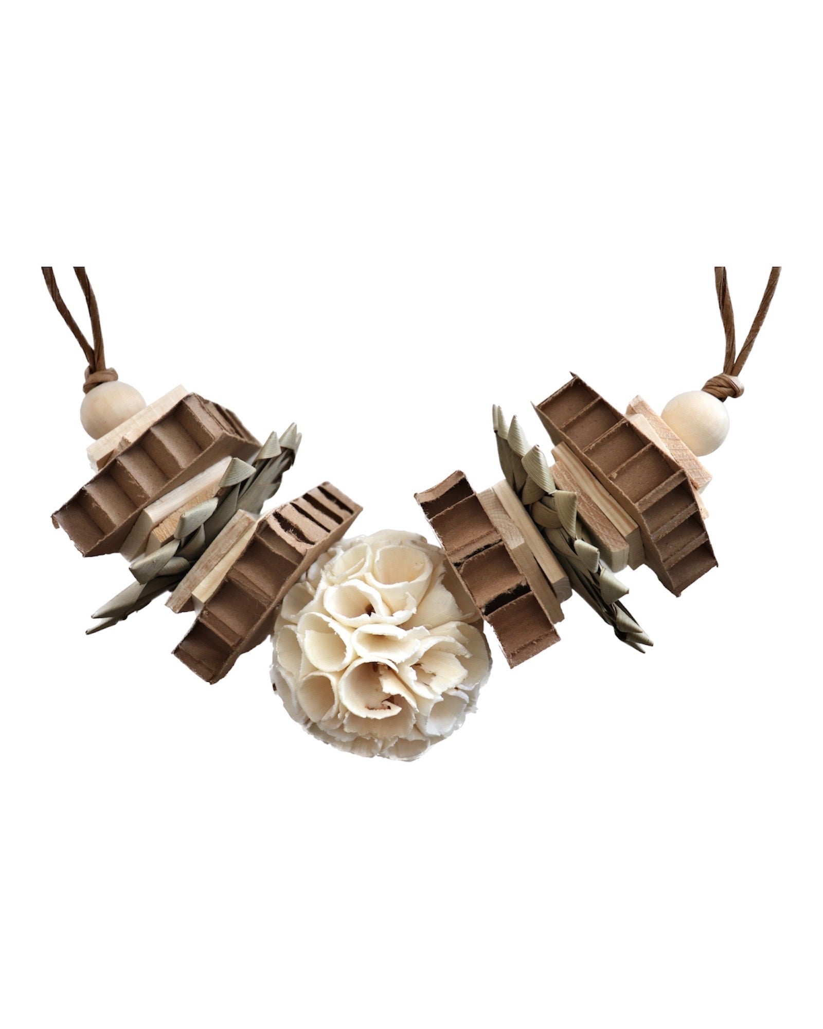 Jouet fabriqué avec du carton, du bois de pin, une boule de sola et des fleurs de palmier