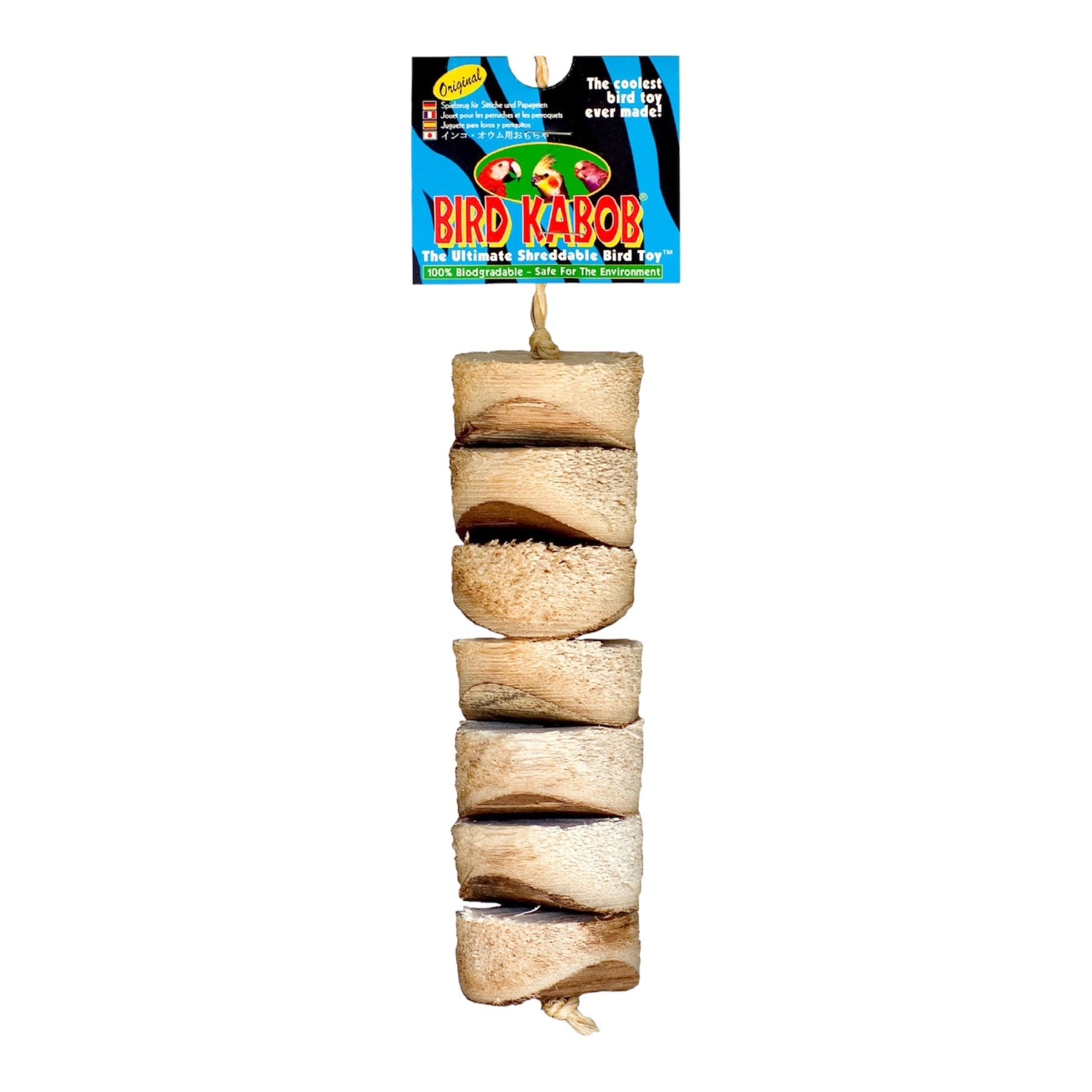 Les jouets Bird Kabob sont fabriqués avec du bois de yucca, un matériel tendre et facile à gruger. Grâce au bois mou, il est facile d'introduire des gâteries afin de stimuler les comportements naturels de recherche de nourriture des perroquets. Venant en plusieurs formes et formats, petits et grands perroquets adopteront Bird Kabob.