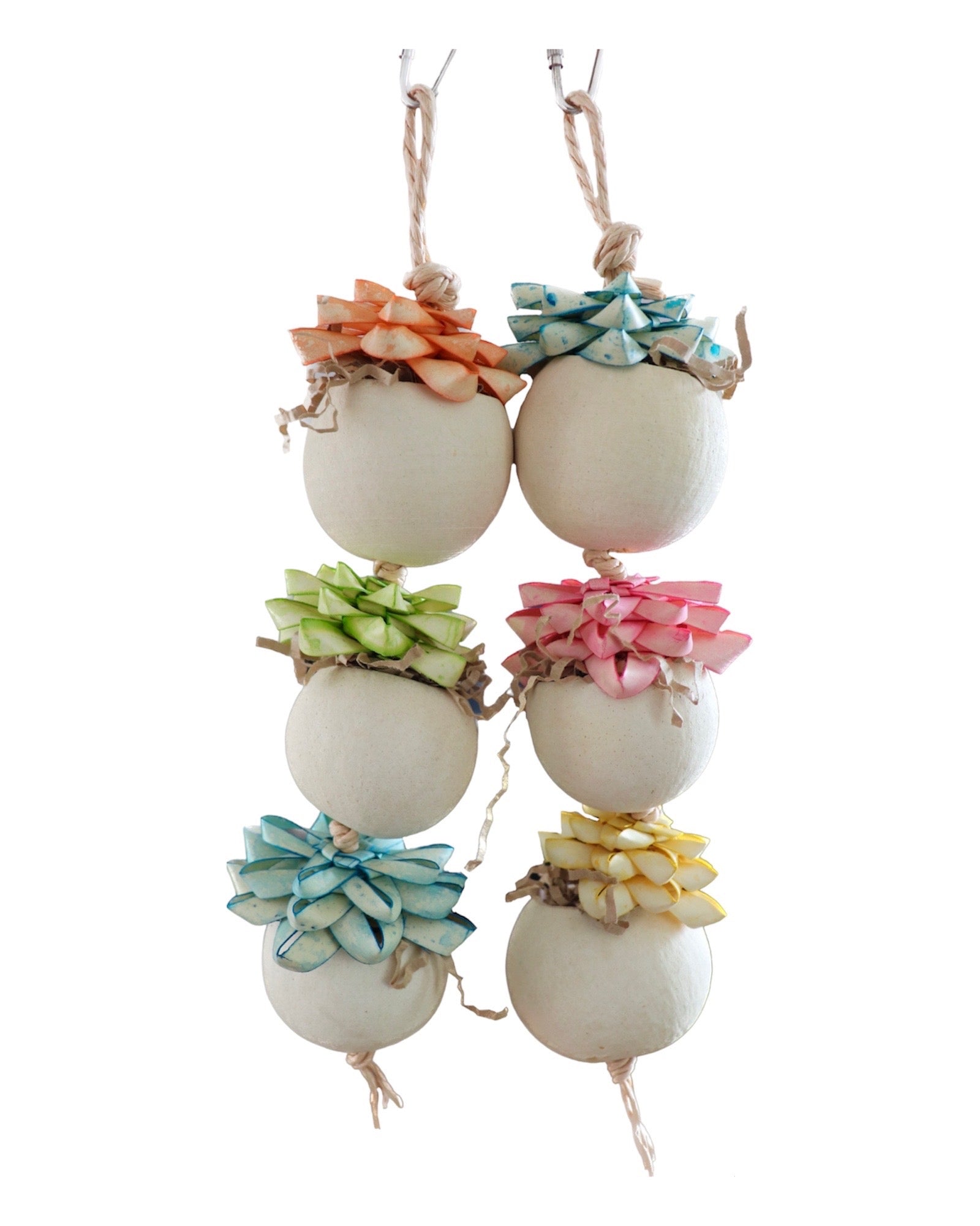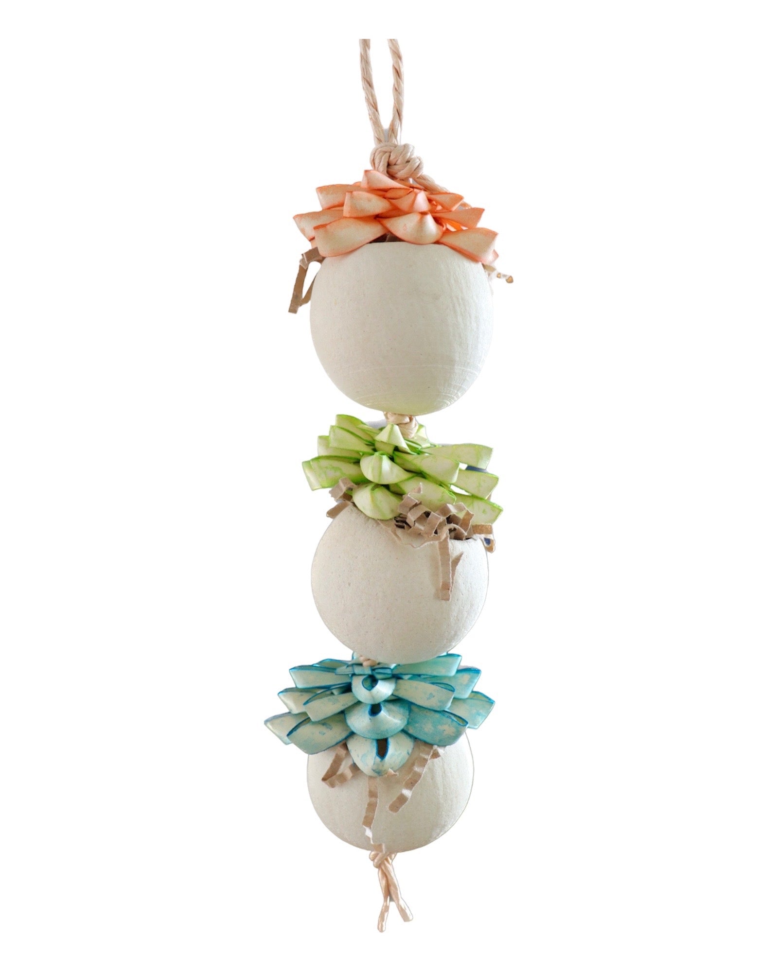 Jouet fabriqué avec des bols en bois, du papier frisé et des fleurs de Palm Leaf.