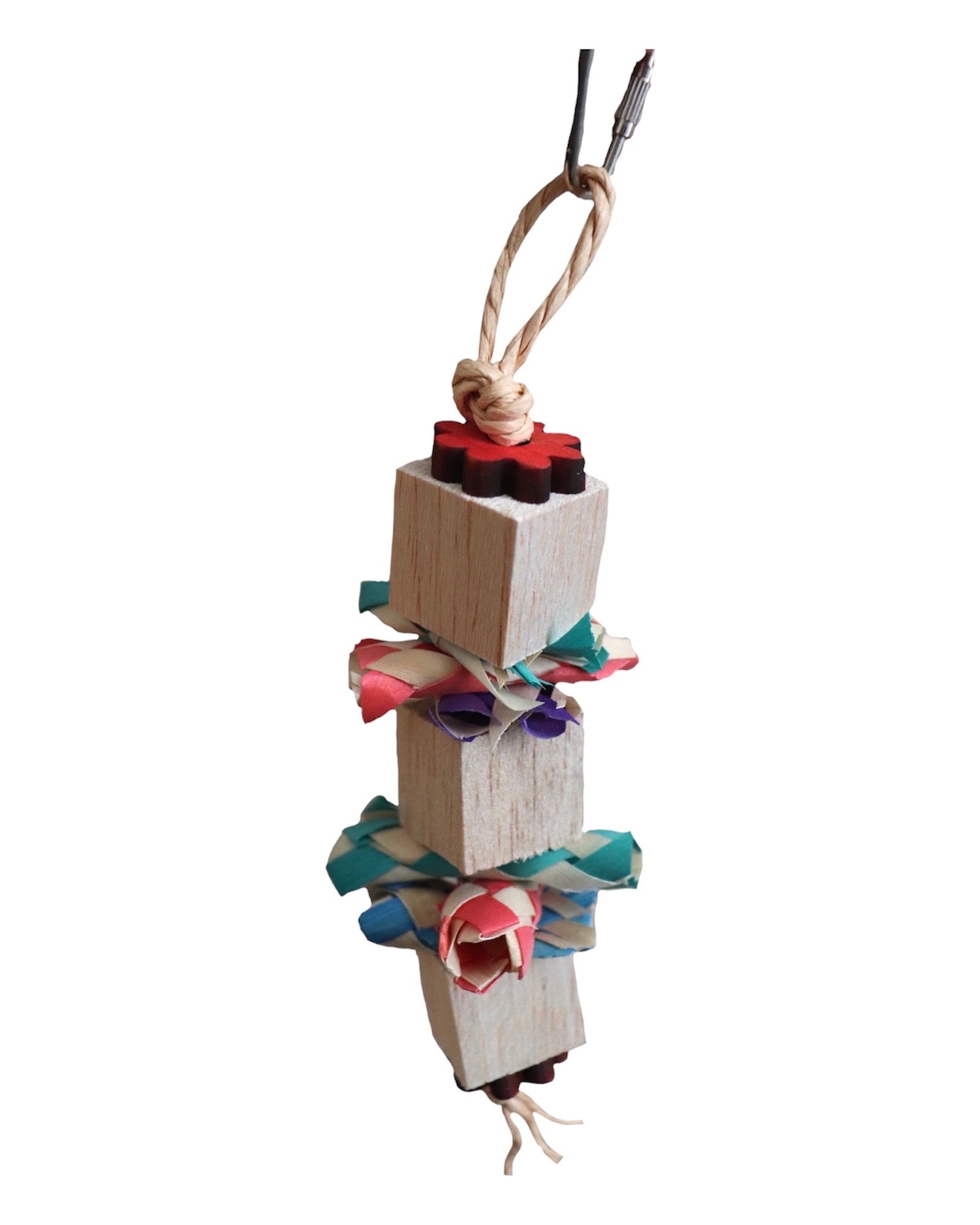 Jouet fabriqué avec des cubes de balsa, des finger trap et des fleurs en bois de pin.