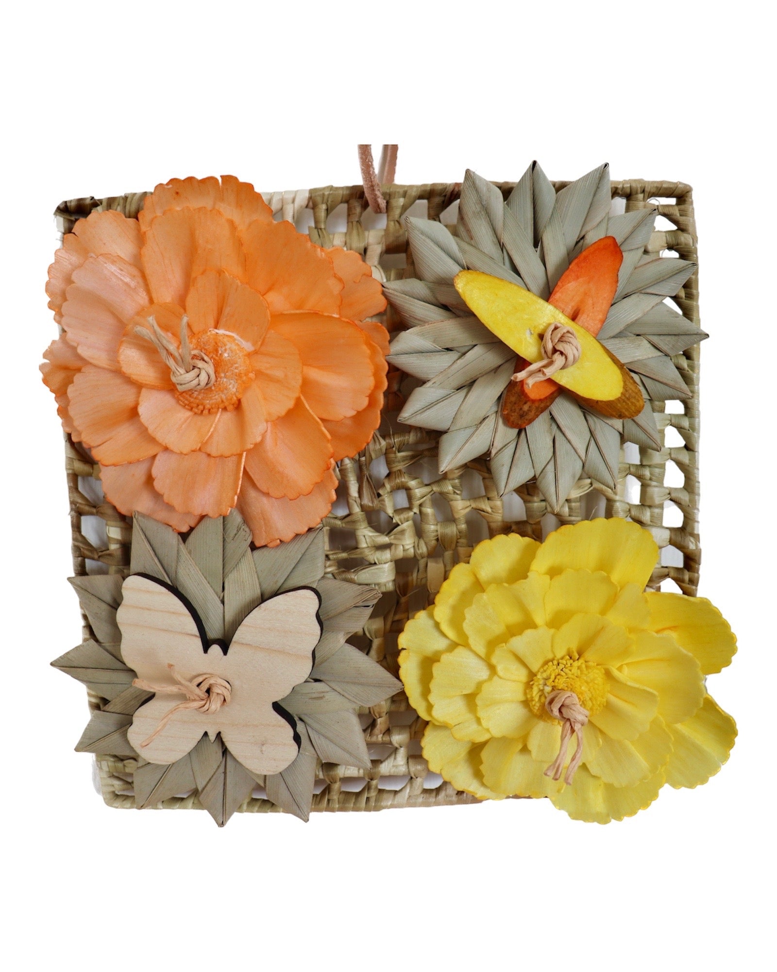 Tapis fabriqué avec des fleurs de palmier, des fleurs de sola et du bois de pin